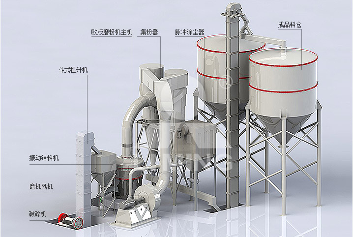 欧式磨粉机整套设备主要由主机、选粉机、风机、颚破、畚斗提升机、电磁振动给料机、储料仓、布袋除尘器、管道装置、旋风集粉器、电控柜、电机等组成。