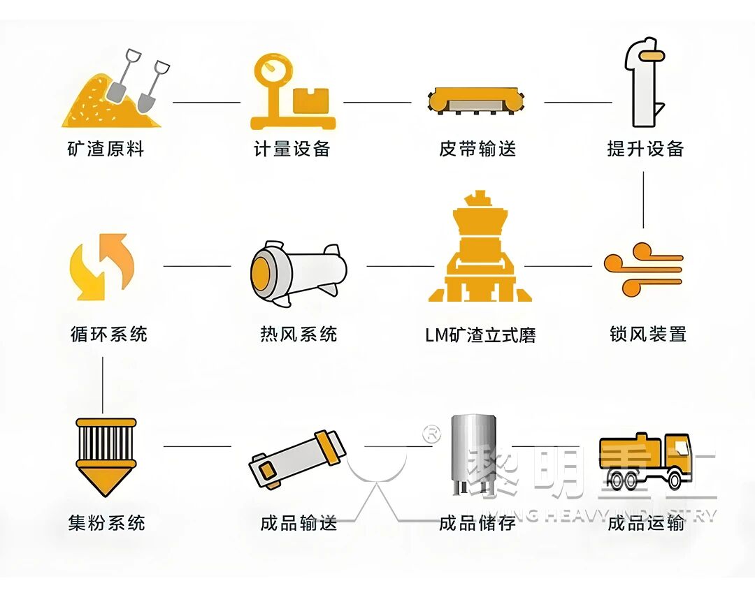 矿渣等原料由装载车运输进厂,经卸料斗、皮带输送机送入矿渣堆棚储存。堆放着的矿渣由铲车取料送至受料斗,再经定量给料设备、皮带输送机送至提升机,在输送过程中,矿渣原料先经由除铁器除铁,再经螺旋输送机等锁风喂料设备送入LM矿渣立式磨进行粉磨,粉磨后的矿渣粉借助热风炉提供的热风,通过选粉机进行选粉,同时得到烘干。符合细度要求的矿渣粉通过收尘器收集,再经空气输送斜槽、提升机进入成品库中储存。