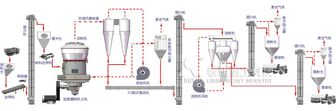 黎明重工的欧版磨粉机粉磨系统采用干式磨粉,在炉外烟气脱硫制粉应用许多,目前在原有基础上将欧版磨粉机的系统优化、风机调整、选粉机优化,并增加二次分级设备,完全能满足炉内和炉外同时供粉的需求,同时生产1mm-0.045mm(炉内脱硫用)和0-0.045(炉外脱硫用)两种不同粒径的石灰石脱硫剂粉。炉内炉外脱硫剂粉磨系统仅增加一台分级机和部分输送设备,相对于传统需要上两套系统生产两种产品,可以大大的节省设备投资和生产用地,在不增加工作人员的基础上节省一套制备系统的人员费用开支。